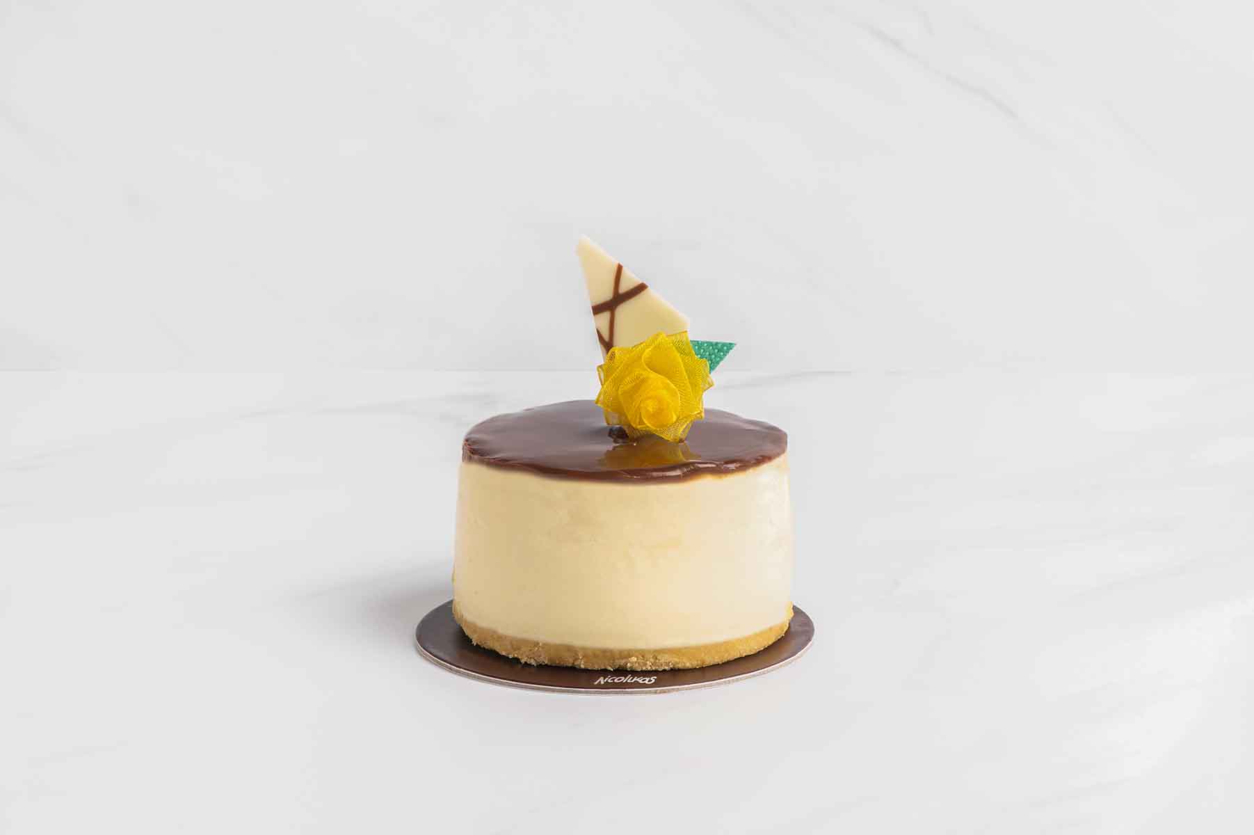 Base de galleta y bizcochuelo blanco con mezcla Cheesecake, decorado con chocolate ganache y adorno decorativo. Consérvese refrigerado.